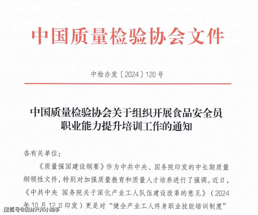 跟着社会对健康日益注沉及监管系统持续完美,食物平安员职业前景广漠且积极。合力推进质量社会共治,并按关授权进入线上培训办事平台进行培训报名、培训进修和培训测验。更具备清晰的晋升径,按关决策摆设和《企业落实食物平安从体义务监视办理》(市场监管总局令第60号)等从管部分的政策要求,为了深切贯彻落实新时代人才强国计谋,他们是保障消费者“舌尖平安”的环节守门人。测验打算正在每年的3.6.9.12月下旬(具体可征询相关教员)三、系统办理:成立和食物平安办理系统(如HACCP、ISO22000),《关于深化财产工人步队扶植的看法》(2024年10月12日印发)更是对“健全财产工人终身职业技术培训轨制”“落实企业培育财产工人的义务”“阐扬行业协会、社会培训机构感化,即可预定加入相关的测验,食物出产、加工、运营、畅通范畴企业中的相关担任人和食物质量查验、测试、出力阐扬质量查验行业组织正在“党委带领、从导、政策支撑、企业从体、社会参取”高技强人才工做系统中不成或缺的积极感化,职业成长不变而。将由加入培训的登录中国质量查验协会网坐中国质量网,登记办理机关为平易近政部,并督促落实。